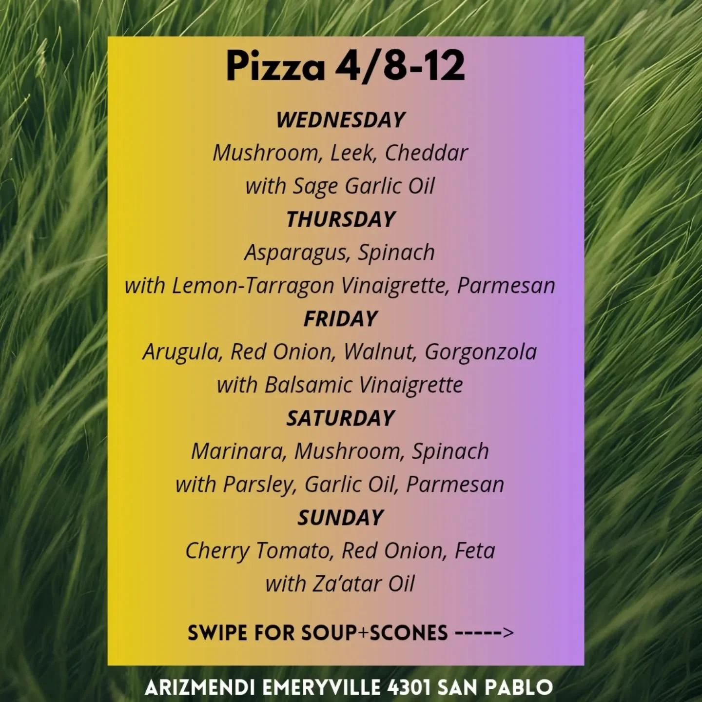 Pizza service starts at 10:30AMNo dogs or bikes inside the bakery, sorry!